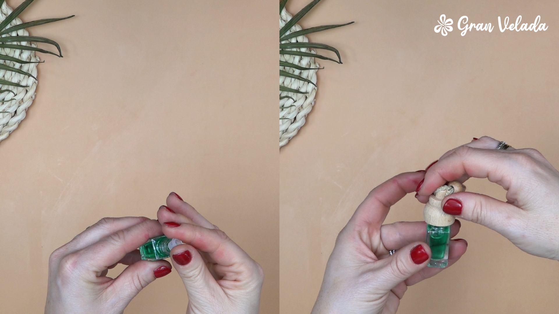 Coloca el tapón de madera y enróscalo bien para cerrar correctamente la botellita.