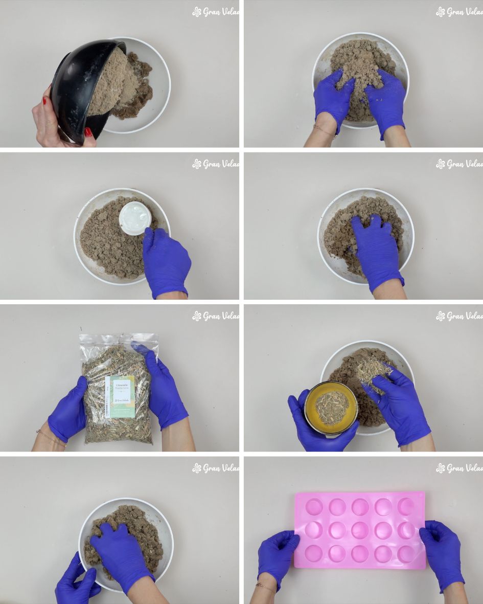 - Añadir la base de incienso: Cuando la mezcla esté templada, agrega los 68 g de base para incienso y mezcla con las manos hasta obtener una masa compacta.