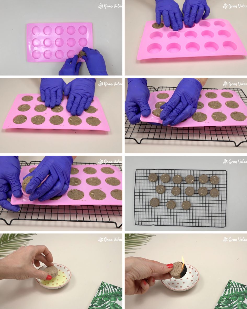 - Moldeado y secado: Rellena moldes de cono, presiona bien y desmolda con cuidado. Deja secar al aire durante 48 a 72 horas en un lugar seco y ventilado.