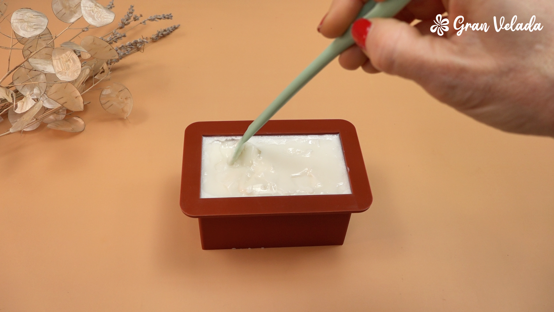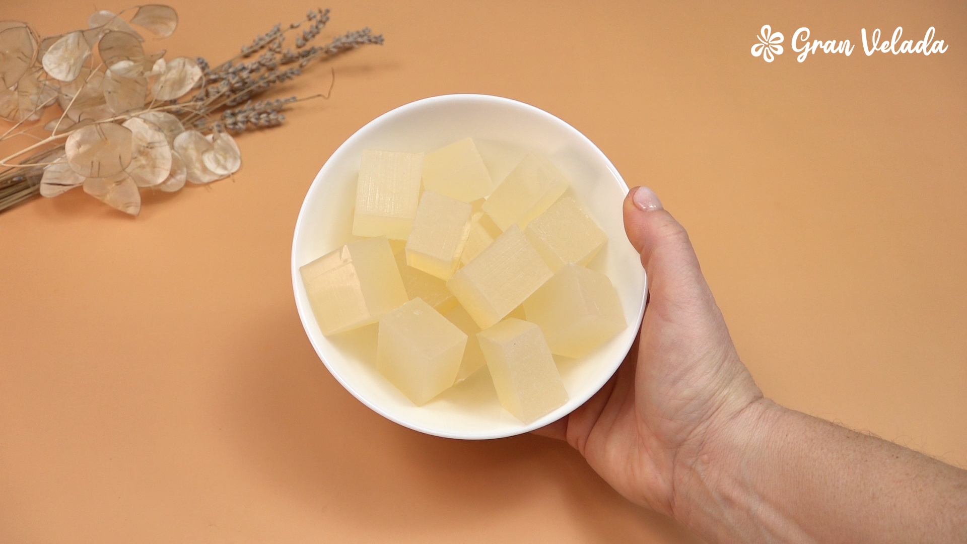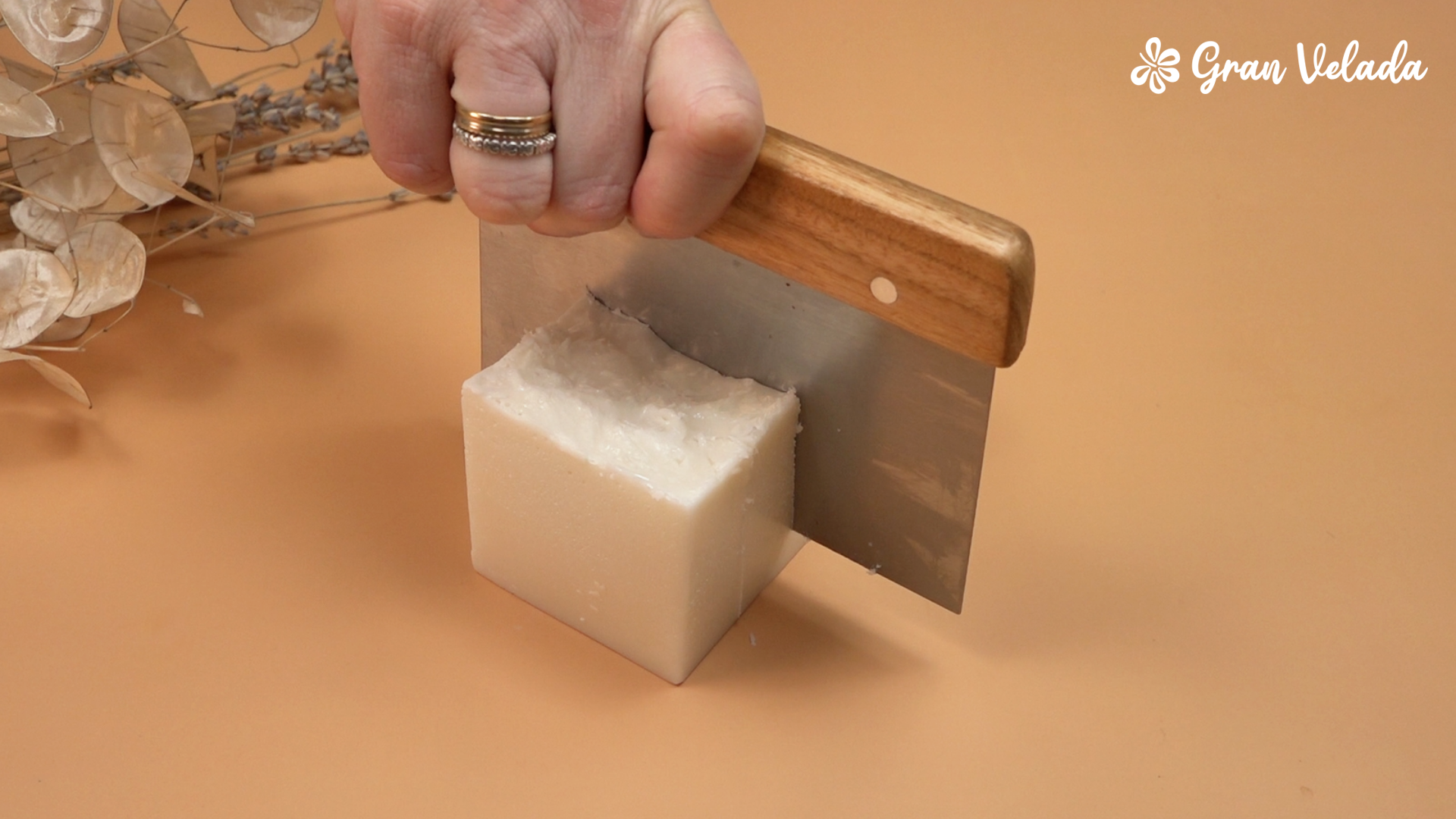 El jabón base de glicerina vegetal de Gran Velada es el punto de partida de esta receta. Se trata de una base sólida preparada para el sistema melt & pour, lo que significa que solo es necesario fundirla, añadir ingredientes y verterla en moldes.