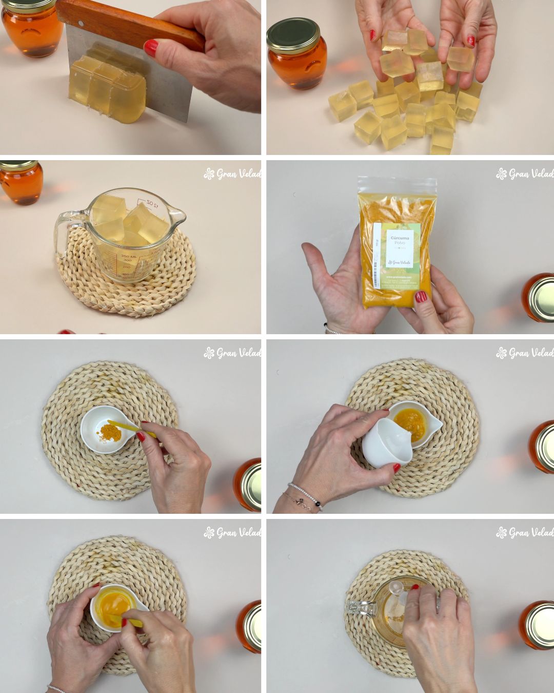 Todos los ingredientes utilizados en esta receta están disponibles en la tienda online de Gran Velada: bases de jabón de glicerina, esencias aromáticas, miel natural, mica cosmética y moldes decorativos. Visita www.granvelada.com para encontrar todo lo necesario y comenzar hoy mismo a crear tus propios jabones.