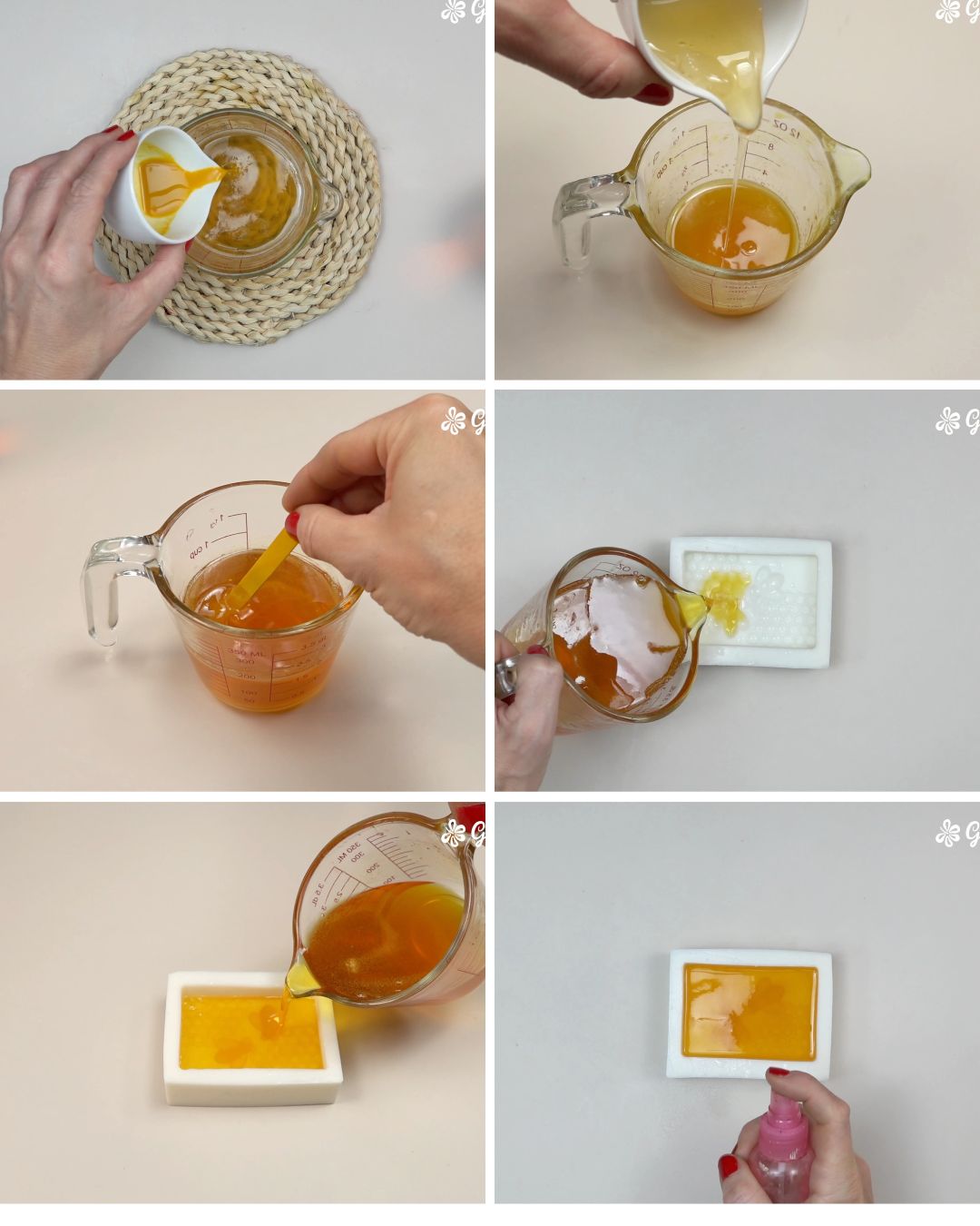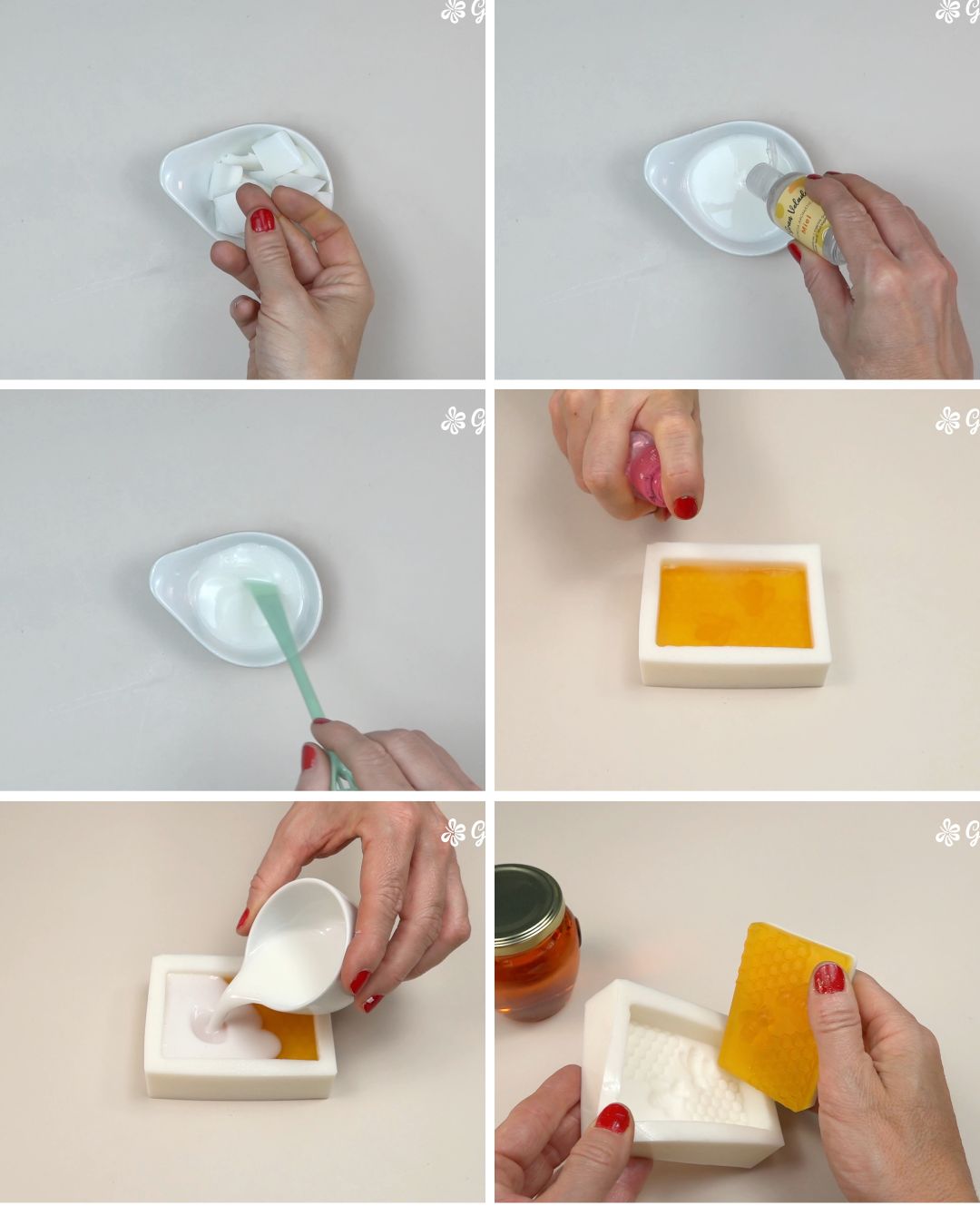 - Fundir 50 g de jabón base de miel a fuego suave o en microondas.