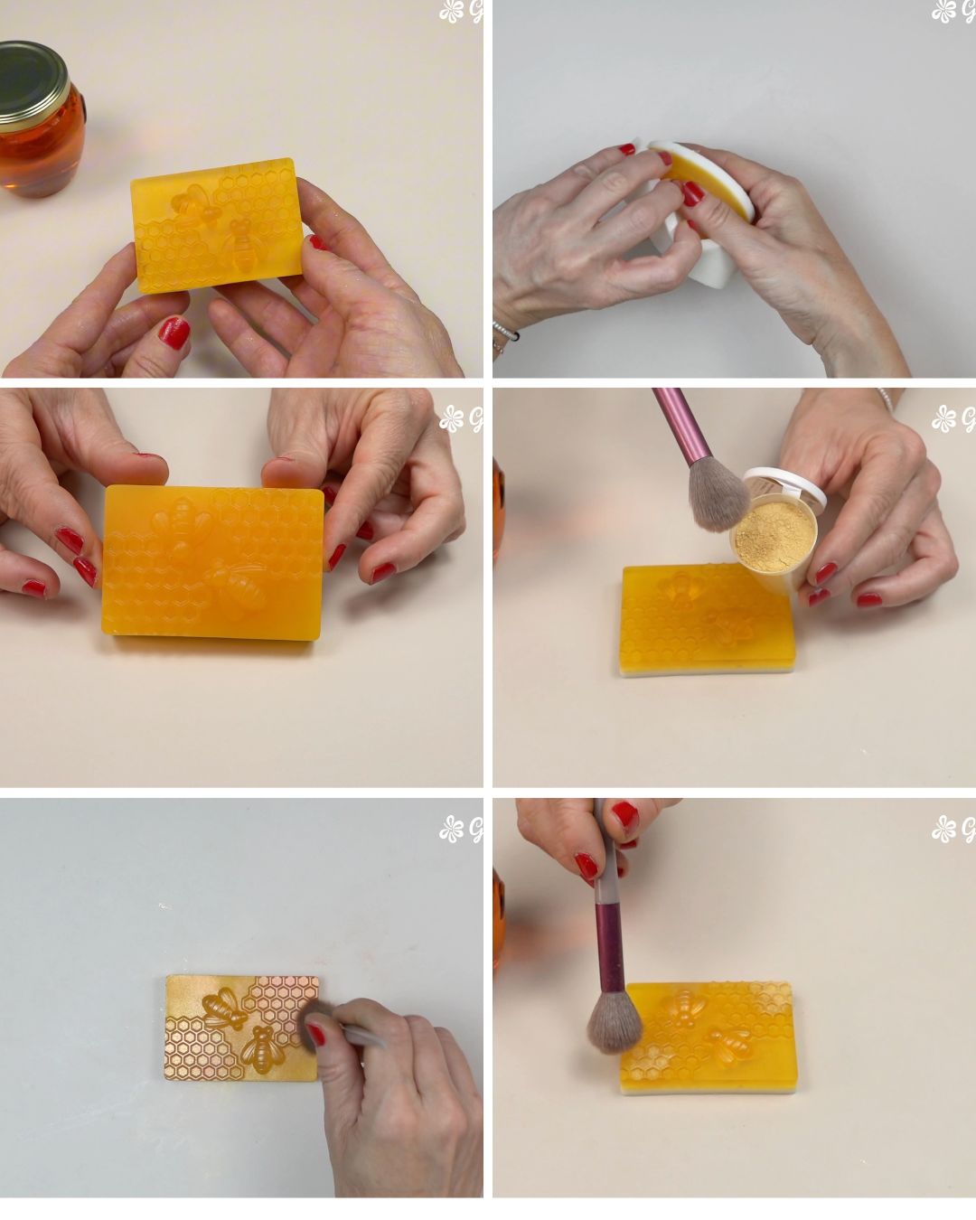 - Con ayuda de una brocha fina, aplicar mica dorada y mica cobre en la superficie para simular el efecto de panal brillante.