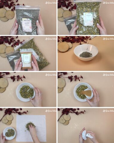 - Pesar y mezclar las flores y semillas en un recipiente.