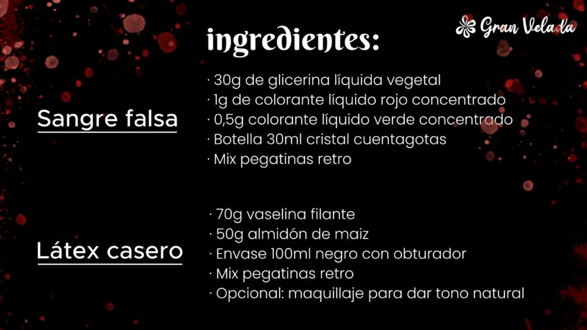 En Gran Velada puedes conseguir todos los ingredientes y envases necesarios para elaborar tanto la sangre falsa como el látex casero. Si haces clic en el banner que aparece más abajo, accederás directamente al carrito de compra con todos los productos listos para añadir al pedido.