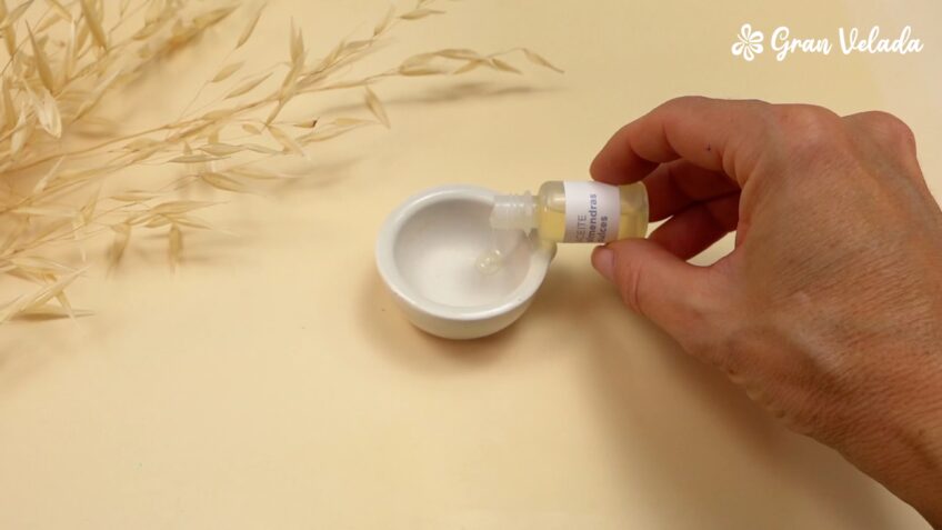 • En un recipiente limpio (puede ser un vaso medidor o un cuenco pequeño), vierte 9 ml de aceite de almendras dulces.