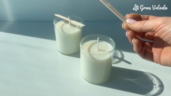 La cera empieza a solidificarse manteniendo la mecha centrada.