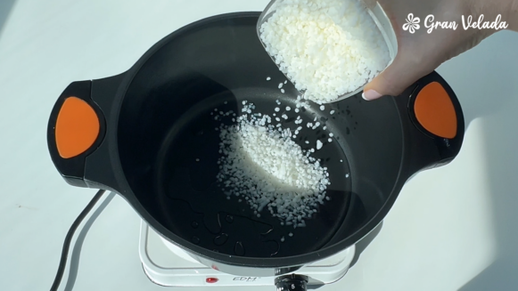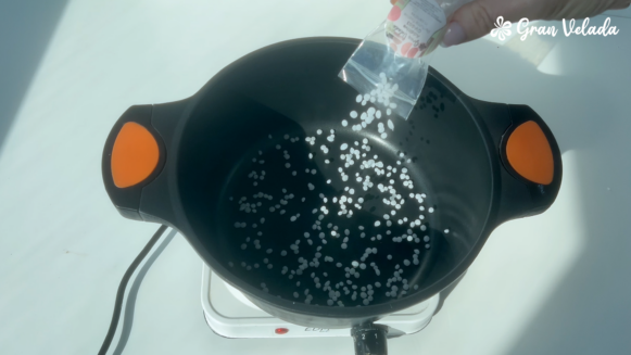 Añade la cera de soja y deja que se funda con el calor.