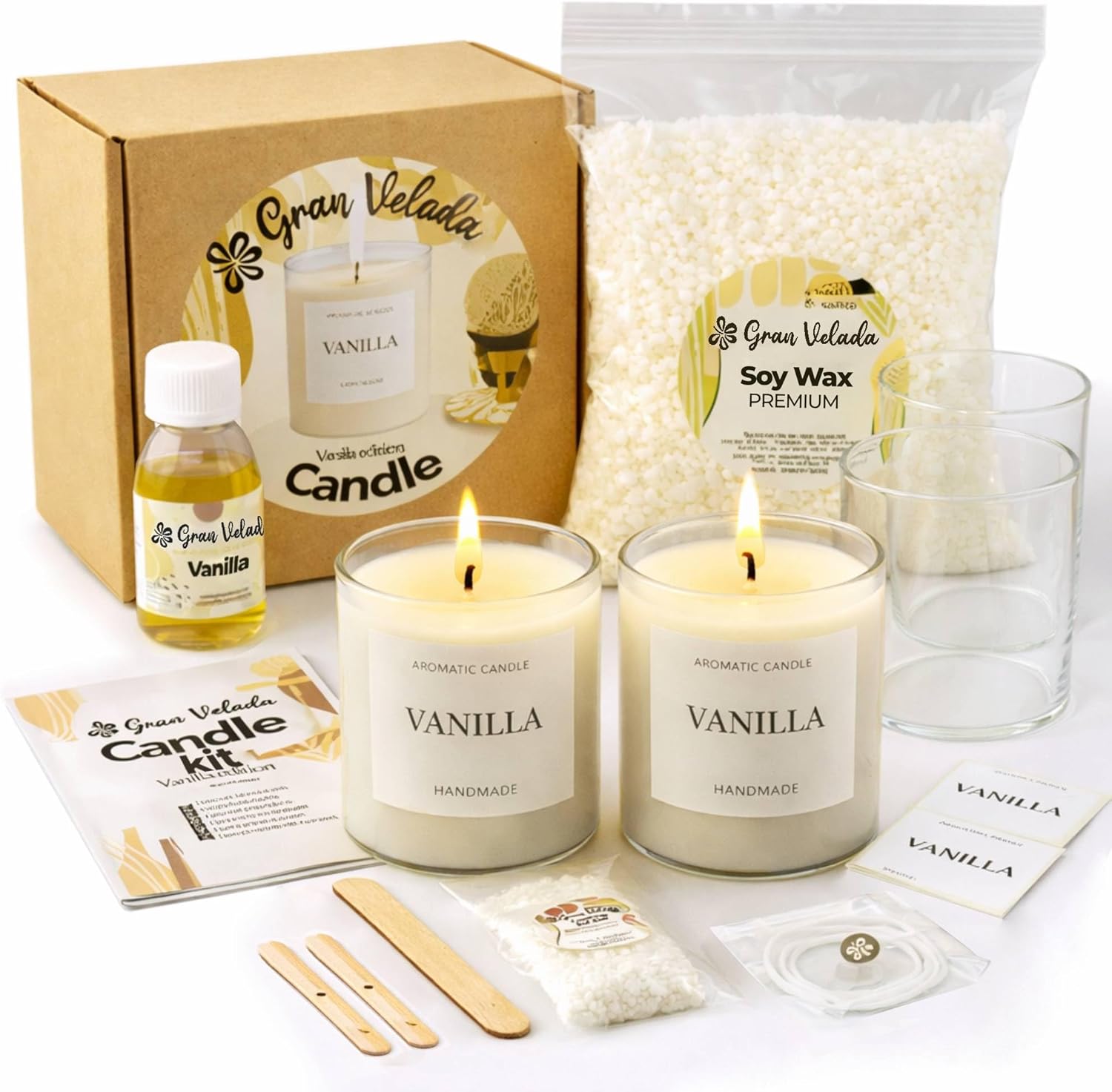 A continuación te mostramos los materiales que incluye este kit de velas Amazon. Todos ellos pertenecen a Gran Velada y están disponibles también de forma individual en su tienda, por lo que no son componentes genéricos, sino productos reales de uso profesional.