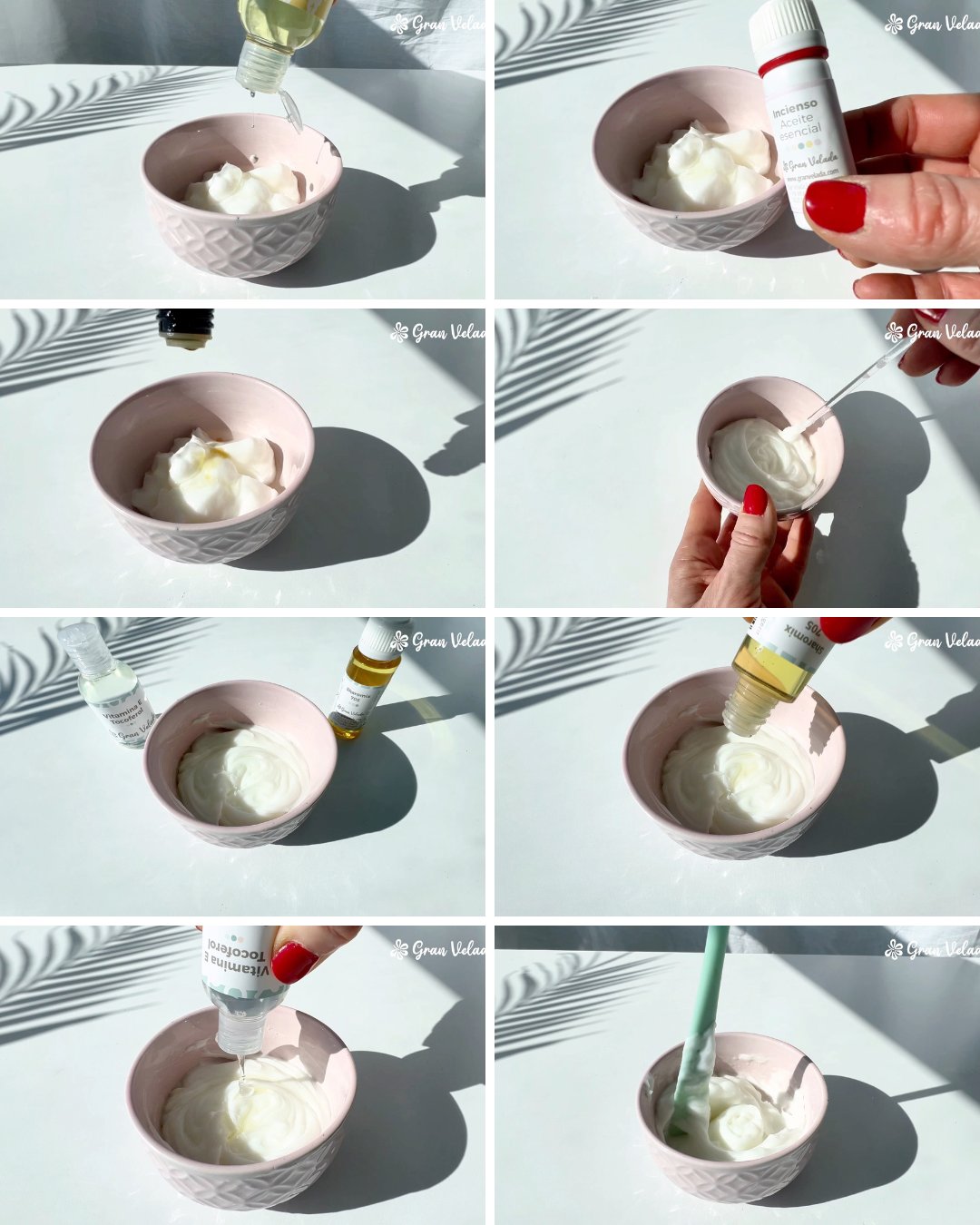 - Incorpora 5 gotas de aceite esencial de incienso, que favorece la regeneración celular y mejora la apariencia de cicatrices.