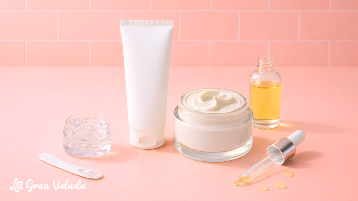 Productos cosméticos: tubo de crema, tarro de emulsión, frasco de sérum con cuentagotas y muestra de gel transparente.