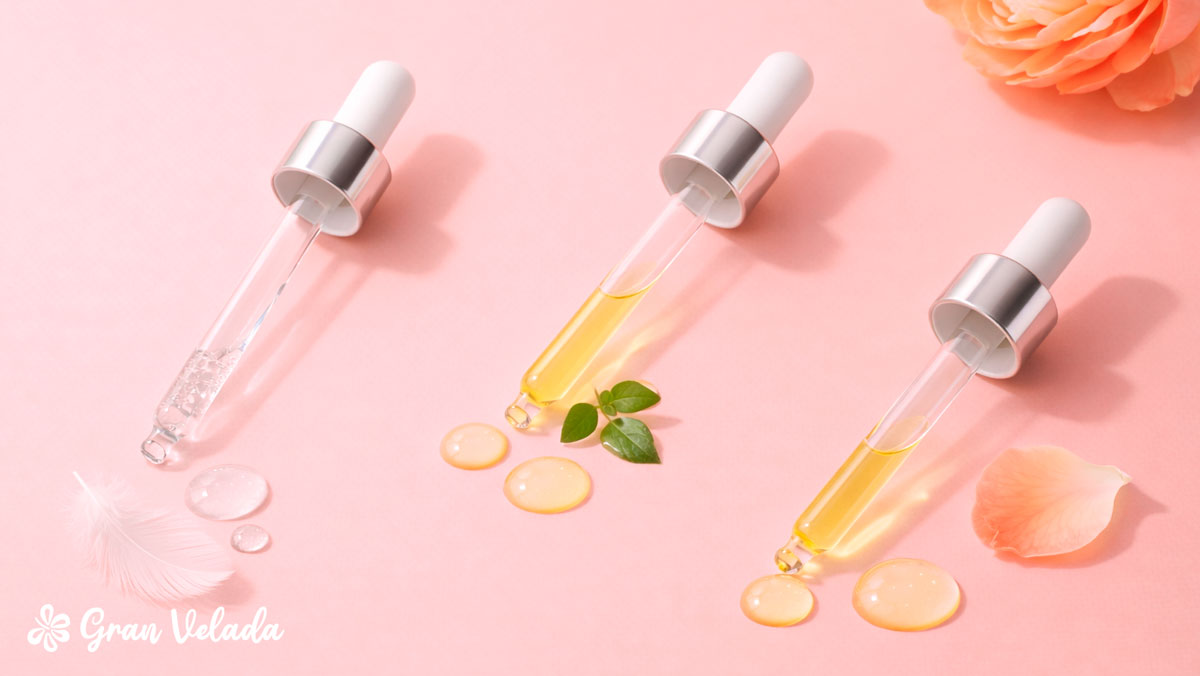 Tres cuentagotas de vidrio con activos cosméticos oleosos y acuosos.