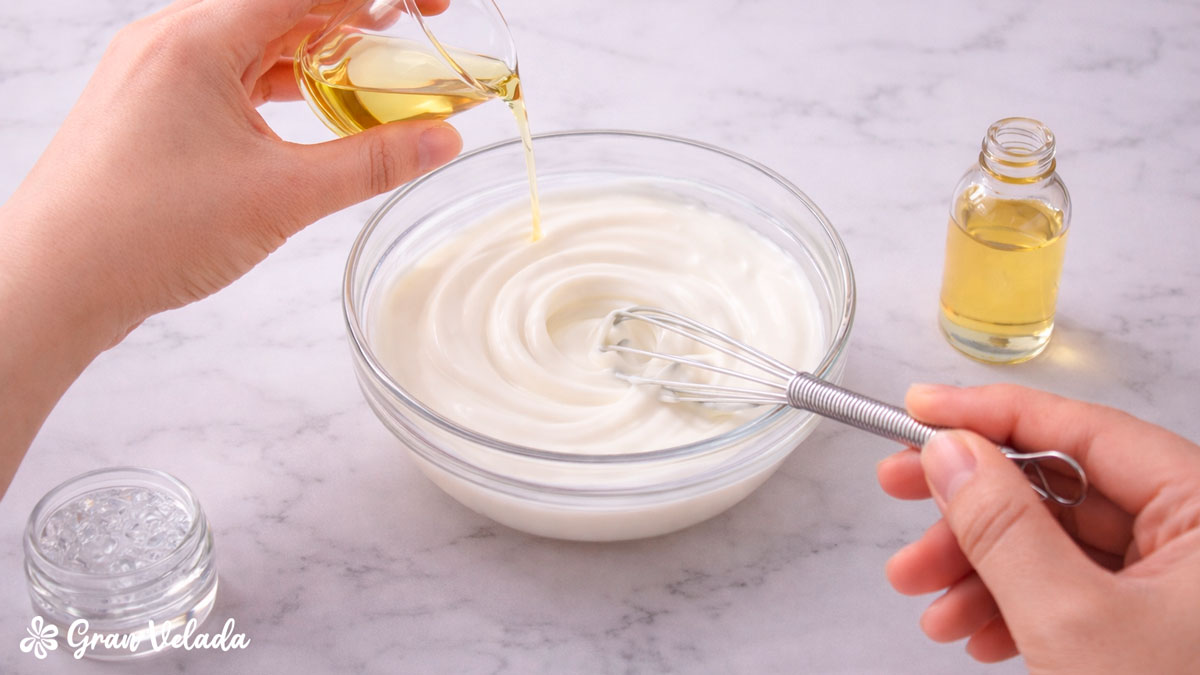 Vertido de un aceite vegetal sobre una emulsión base mientras se agita con un mini batidor de varillas.