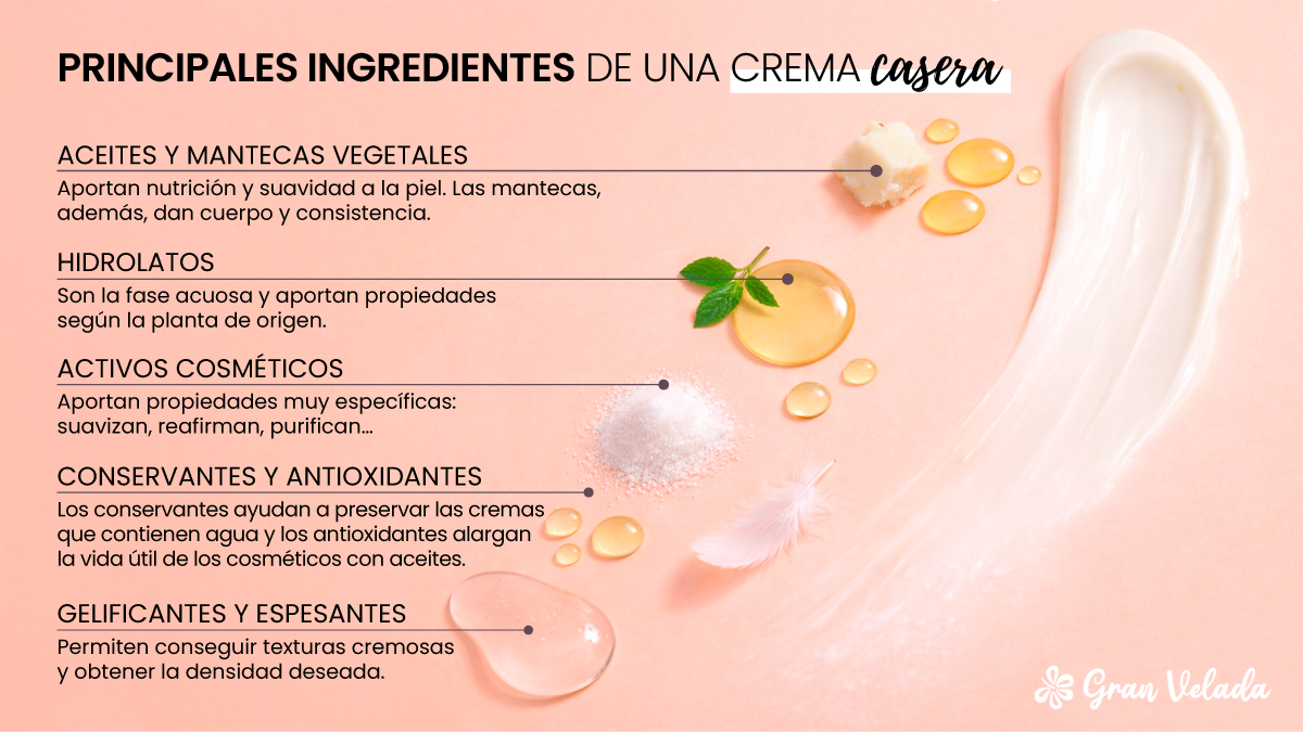 En este apartado se recogen los ingredientes básicos que forman la estructura de una crema cosmética casera. Son los elementos esenciales a partir de los cuales se construye la fórmula y que determinan tanto la función del producto como su textura, estabilidad y sensación sobre la piel.