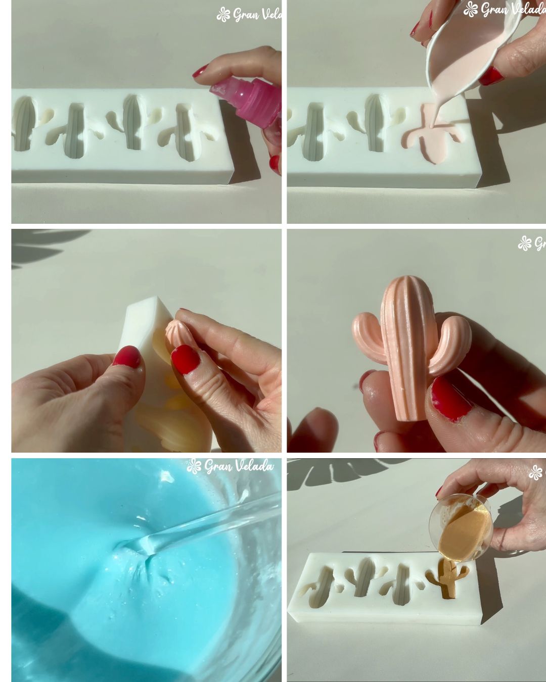 Hacer jabones de cactus es un proceso fácil y divertido, solo necesitas seguir los pasos con atención para conseguir un resultado perfecto. Un aspecto clave a la hora de fundir la base de glicerina es evitar el sobrecalentamiento, ya que si el jabón se calienta demasiado, con el tiempo puede desarrollar un efecto de «sudoración», formando pequeñas gotas de humedad en la superficie.
