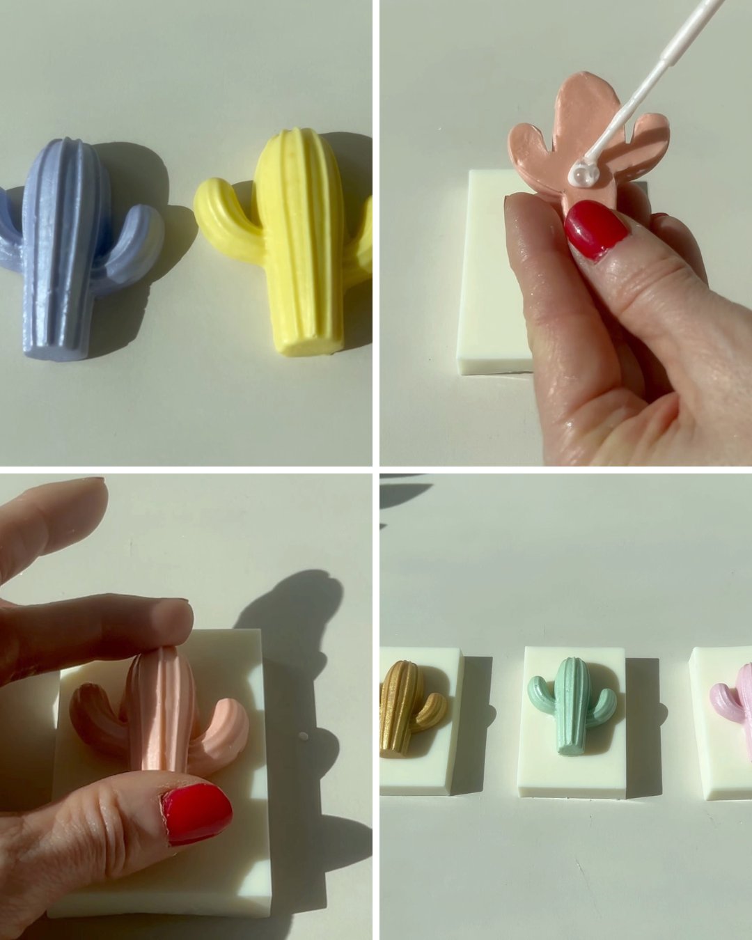 - Pega el cactus sobre la pastilla de jabón rectangular.