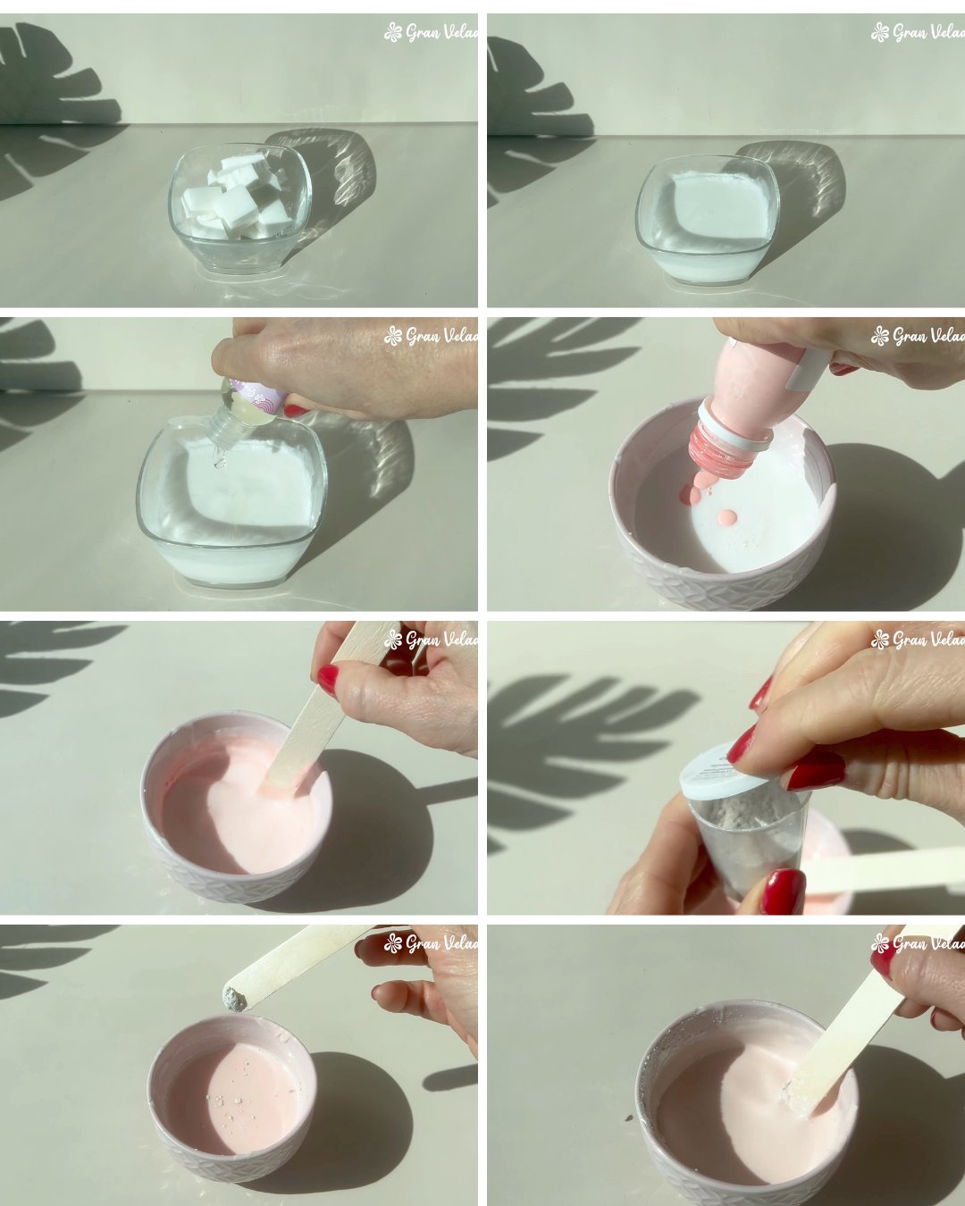 - Derrite la base en el microondas en intervalos de 10 segundos o a baño maría, removiendo para evitar burbujas.