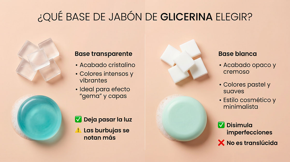 La diferencia entre una y otra está únicamente en el acabado final. La base blanca da un aspecto más opaco y cremoso, mientras que la base transparente permite ver el interior del jabón y es ideal si quieres añadir colores, decoraciones o capas. A nivel de uso y dificultad, no hay diferencia, por lo que puedes elegir simplemente la que más te guste visualmente.