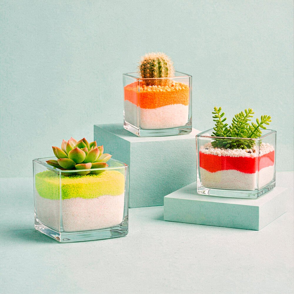 Las arenas de colores son un elemento decorativo muy versátil. Su tonalidad amarillo neón aporta un toque moderno y creativo a cualquier composición. Combinando diferentes colores puedes crear diseños únicos y muy vistosos. Algunas ideas: