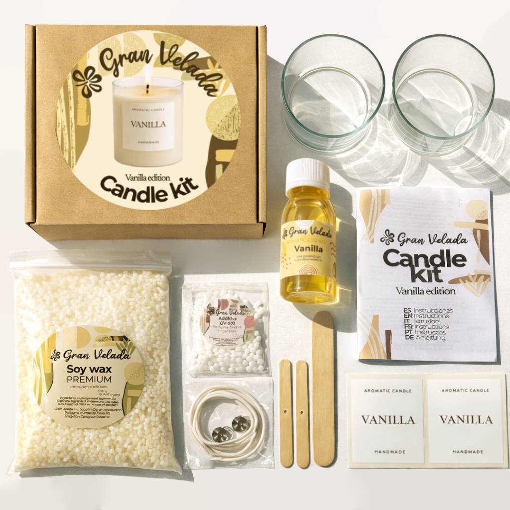 Candle kit para hacer velas aromáticas en casa, un completo kit DIY para velas con el que podrás crear fácilmente tus propias velas en vaso de soja con acabado profesional. Incluye cera de soja, esencia aromática de vainilla, mechas, vasos de cristal y accesorios, todo lo necesario para iniciarte en el mundo de las velas artesanales sin experiencia previa. Con este kit para hacer velas paso a paso podrás elaborar velas decorativas con un aroma dulce y envolvente, ideales para ambientar cualquier espacio o regalar. Es perfecto como kit de iniciación para hacer velas o como detalle creativo para amantes del DIY.