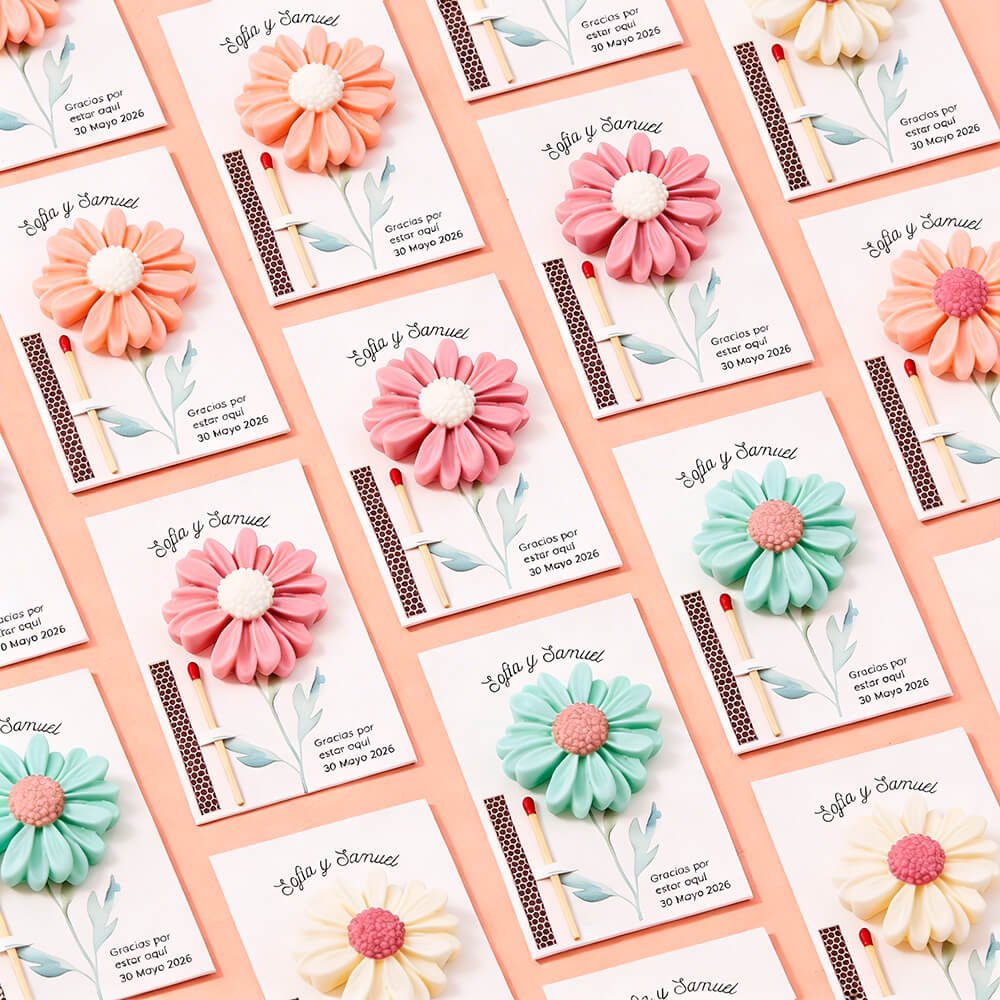 Cartón personalizado margarita para detalles, ideal para presentar velas y pequeños regalos en bodas, comuniones, bautizos y todo tipo de eventos especiales. Este cartón para packaging de detalles cuenta con un delicado diseño floral y está pensado para fijar una velita en la parte frontal, creando un recuerdo artesanal bonito y cuidado. Además, incorpora un orificio para introducir un fósforo, lo que permite completar el detalle de forma práctica y original. Es perfecto para acompañar velas hechas a mano y presentarlas en bolsitas de celofán o packaging decorativo, consiguiendo un acabado profesional y personalizado para tus invitados. La velita y la cerilla no están incluidas.