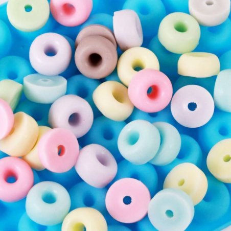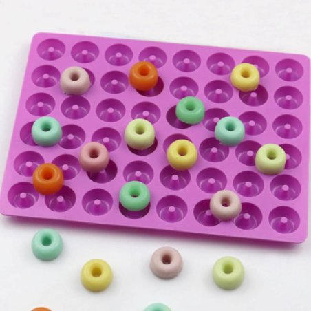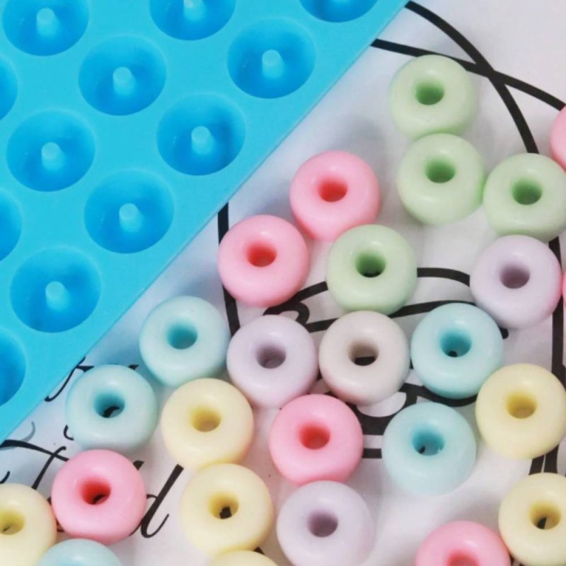 Molde 48 mini toppings, mini donut, mini rosquilla, ideal para hacer wax melts (cera perfumada), jaboncitos mini y pequeños adornos decorativos. Su diseño tipo “donut” crea piezas redondeadas y uniformes que funcionan genial como relleno aromático, detalle de packaging o topping para velas en vaso (con cera chantilly).