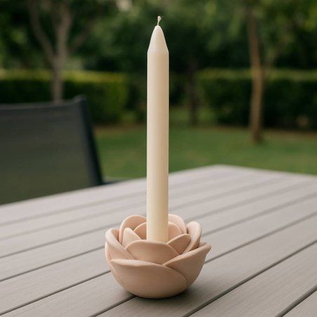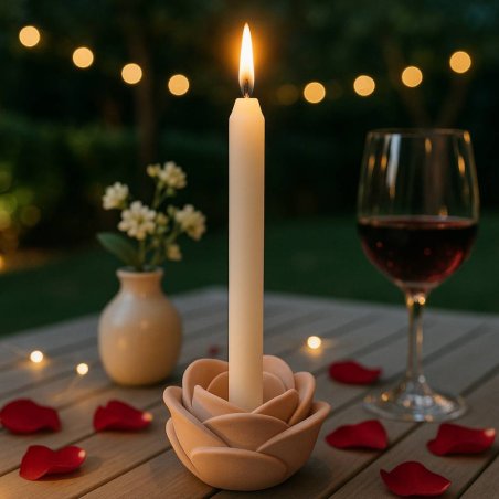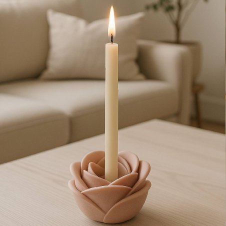 Molde portavelas forma de rosa, ideal para hacer portavelas artesanales en casa con yeso, cemento o resina. Su diseño con pétalos en relieve permite crear piezas elegantes y decorativas, perfectas para velas tipo cirio o candelabro. Es flexible, antiadherente y reutilizable, por lo que resulta muy fácil de desmoldar y limpiar. Con él podrás elaborar portavelas románticos para bodas, cenas o regalos hechos a mano. Alto 5 cm, diámetro 7,2 cm.