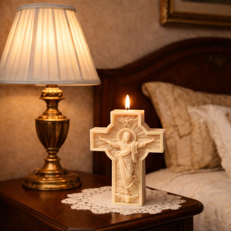 Con este molde podrás elaborar velas decorativas perfectas para eventos especiales, celebraciones religiosas o ambientaciones con un toque simbólico. Su diseño destaca por la combinación de la forma de cruz con la figura central, aportando profundidad y detalle a cada pieza.