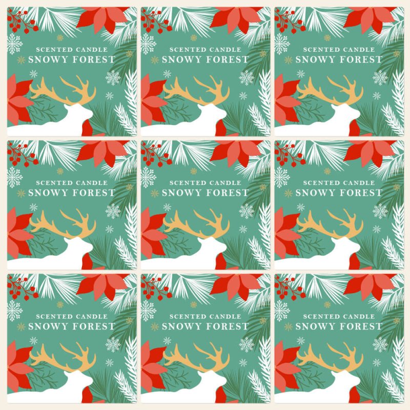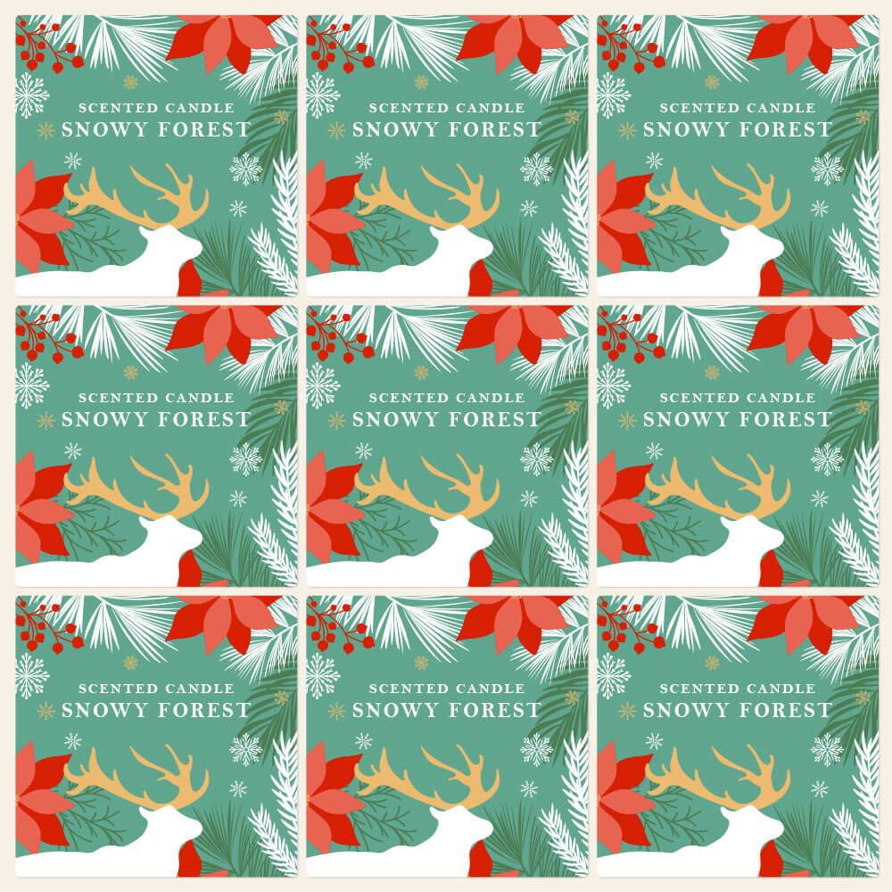 Pegatinas “Vela aromática · Bosque Nevado” para velas en vaso, con diseño invernal de ciervo, flores de pascua y ramas nevadas. Perfectas para decorar velas navideñas y crear un ambiente festivo con estilo natural. Estas pegatinas de Navidad se adhieren fácilmente sobre superficies limpias y lisas, ideales para personalizar tus velas DIY, detalles de regalo o packs aromáticos. Con ellas podrás dar un acabado cuidado y coherente a tus velas en vaso de edición navideña.