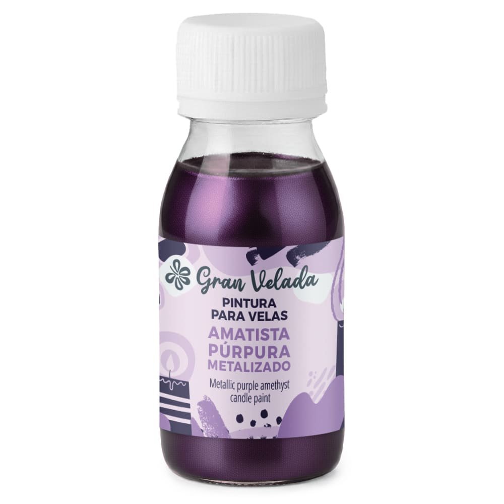 La pintura para velas que puedes comprar en nuestra tienda online está especialmente diseñada para pintar sobre superficies de cera. Se presenta en formato líquido y está disponible en una amplia paleta de colores, con tonos metalizados, perlados, neutros y neón. En concreto, el amatista púrpura metalizado destaca por su tonalidad intensa y brillante, perfecta para crear diseños sofisticados y llenos de personalidad.