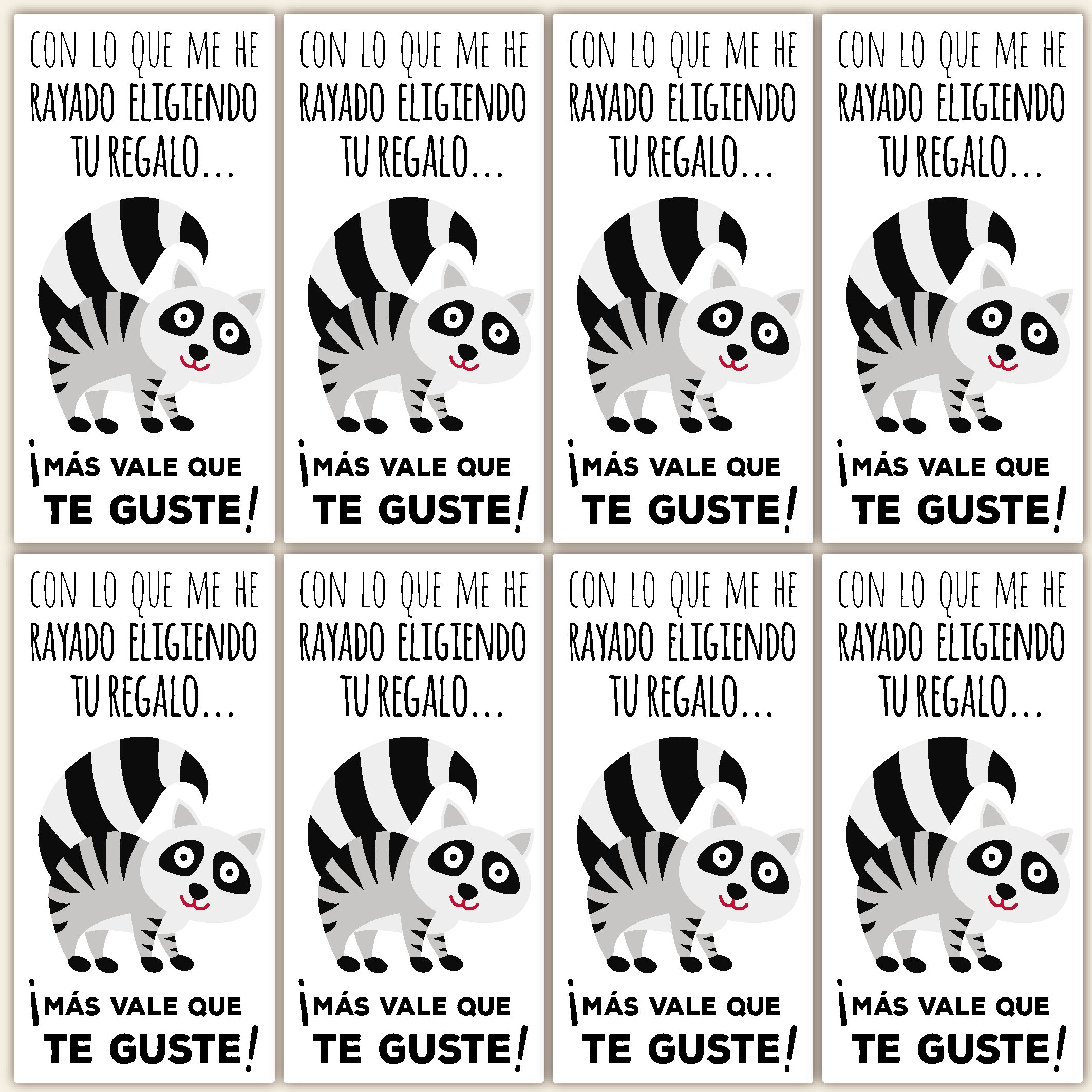 Blister de 8 autocollants pour cadeaux avec raton laveur, 4,5 x 8 cm. Ce sont des étiquettes pour des cadeaux originaux, avec un raton laveur amusant comme protagoniste. L’étincelle de l’autocollant vient de la main de la phrase qui accompagne le dessin : « Avec ce que j’ai gratté en choisissant ton cadeau... Tu ferais mieux de l’aimer ! » Ces étiquettes amusantes sont allongées, le raton laveur est au centre et en haut et en bas, le texte apparaît. C’est un autocollant noir et blanc, avec une seule touche de rouge : la petite bouche de raton laveur. Avec eux, vous pouvez décorer vos cadeaux d’une manière colorée et frappante!