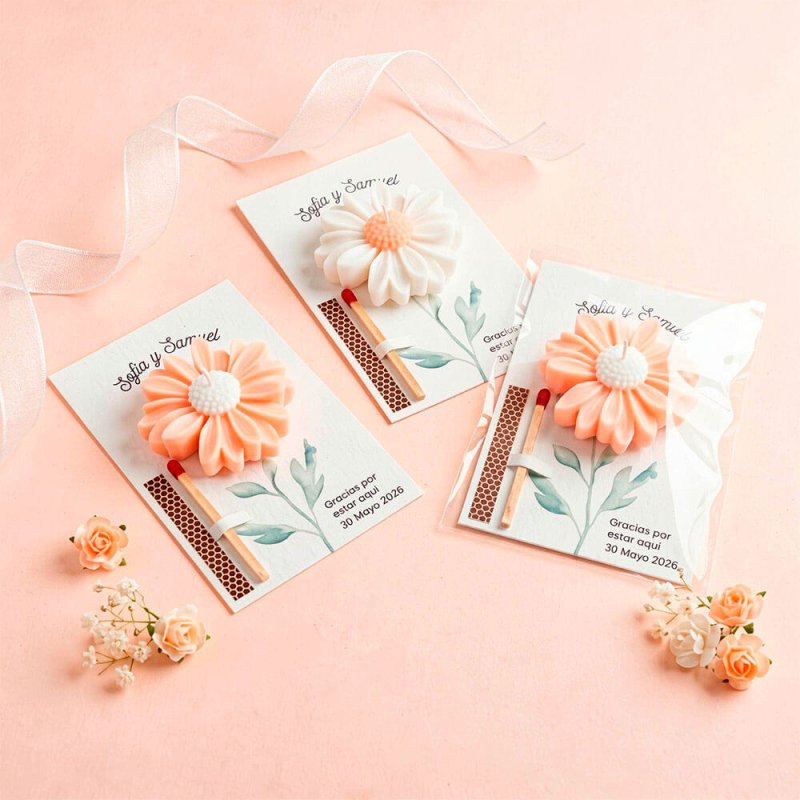Carton personnalisé marguerite pour cadeaux invités, idéal pour présenter des bougies et petits cadeaux lors de mariages, communions, baptêmes et tout type d’événements spéciaux. Ce carton pour packaging de cadeaux présente un délicat design floral et est conçu pour fixer une petite bougie sur la partie frontale, créant un souvenir artisanal joli et soigné. Il intègre également un orifice pour insérer une allumette, permettant de compléter le détail de manière pratique et originale. Il est parfait pour accompagner des bougies faites main et les présenter dans des sachets en cellophane ou un packaging décoratif, obtenant ainsi un rendu professionnel et personnalisé pour vos invités. La bougie et l’allumette ne sont pas incluses.