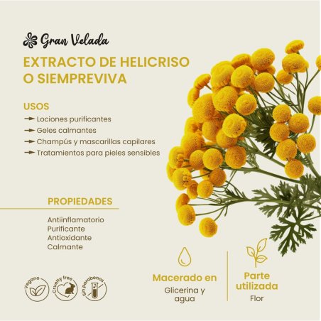 Chez Gran Velada, vous pouvez acheter de l'extrait hydrosoluble d'hélichryse de haute qualité. Il est parfait pour créer des cosmétiques personnalisés et faits maison. Passez votre commande maintenant et recevez chez vous tous les ingrédients nécessaires à vos formulations. Nous proposons des ventes en gros et au détail, avec un service personnalisé.