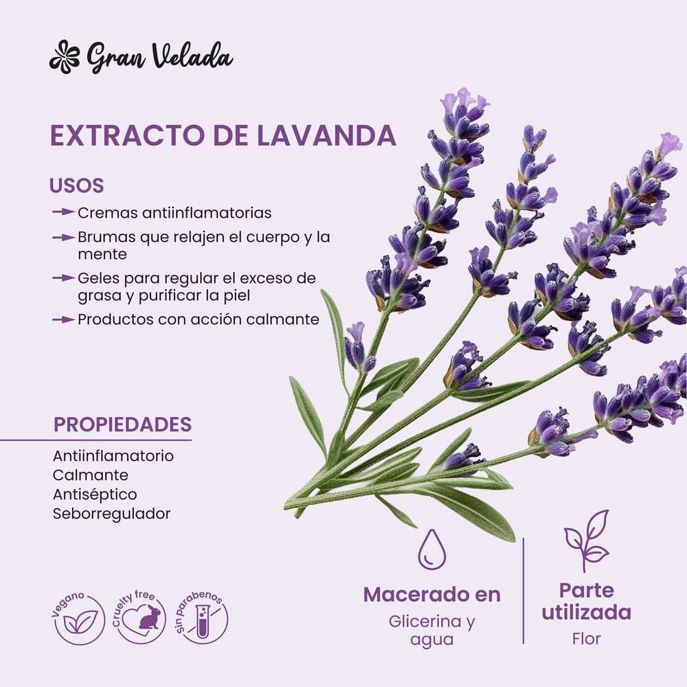 En Gran Velada puedes comprar extracto de lavanda, un macerado hidrosoluble de las flores de esta planta. El resultado es estupendo para usar como ingrediente cosmético y formular una amplia gama de productos para cuidar la piel y el cabello.