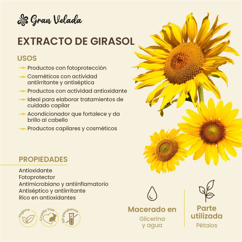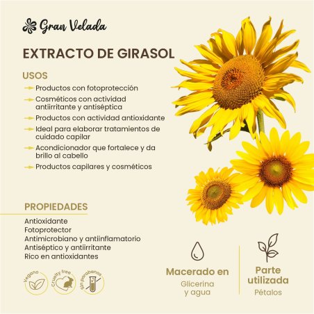 Chez Gran Velada, vous pouvez acheter de l’extrait hydrosoluble de tournesol et bien d’autres ingrédients pour vos cosmétiques naturels. Vente au détail et en gros, avec livraison rapide et conseils personnalisés.