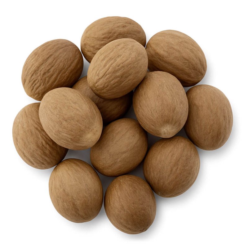 Noix de muscade en grain, graines sèches issues de Myristica fragrans, riches en composés aromatiques et antioxydants aux propriétés tonifiantes, purifiantes, antioxydantes et stimulantes. Ingrédient traditionnellement utilisé dans les préparations à base de plantes pour revitaliser et équilibrer la peau. Peut être utilisé comme base végétale dans des formulations de cosmétique naturelle maison.