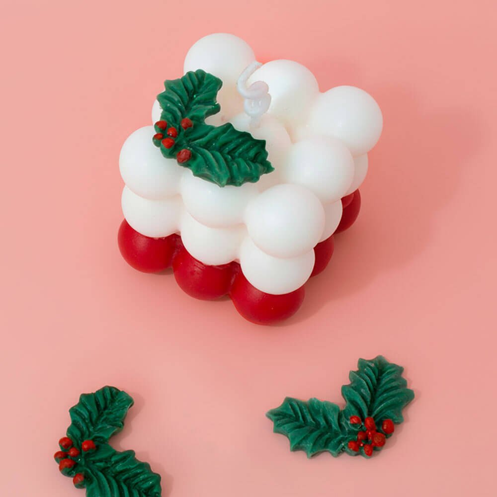6) Assemblage : Démouler les bougies bubble et coller les feuilles de houx avec un peu de cire fondue. Presser légèrement pour fixer. Former une spirale avec la mèche.