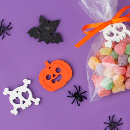 5. Montage final : Une fois sèches, faites passer les rubans en raphia dans les figurines, remplissez les sachets de cellophane de bonbons d’Halloween et fermez-les en utilisant les figurines comme ornement.