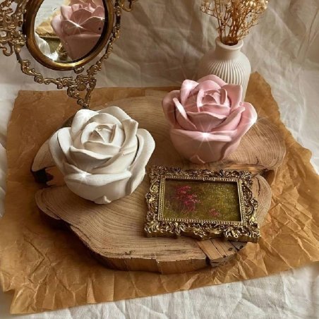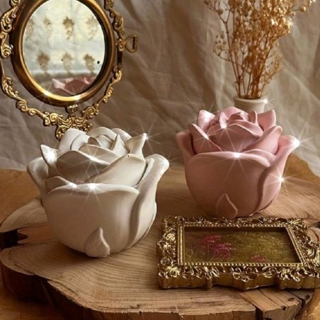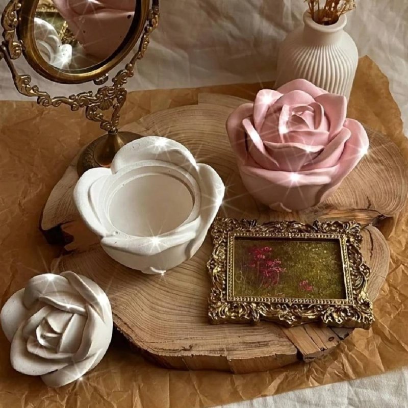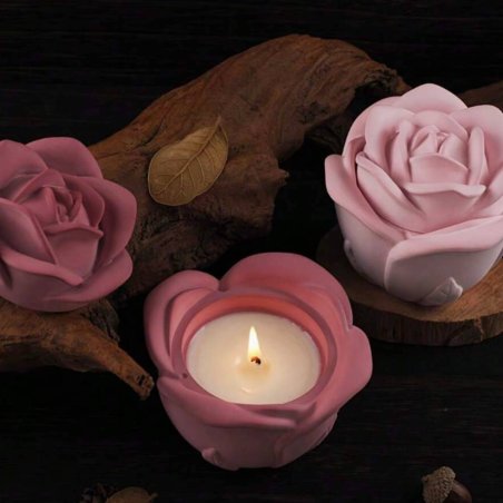 Moule récipient pour bougies en forme de rose avec couvercle, idéal pour créer des coupelles décoratives avec des pétales en relief. Fabriqué en silicone de haute qualité, il est anti-adhérent, flexible et réutilisable, ce qui permet un démoulage facile et une excellente définition. Le set comprend 2 pièces (corps + couvercle). Vous pouvez l’utiliser avec du ciment coloré pour figurines, de la résine à base d’eau ou du plâtre ; une fois sec, il suffit de le remplir de cire et d’ajouter la mèche pour obtenir une bougie en contenant, prête à offrir ou à utiliser comme décoration.