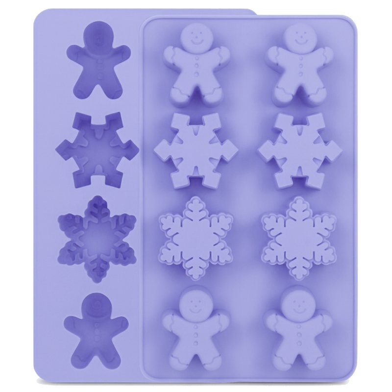 Moule en silicone avec 8 cavités pour réaliser des créations de Noël en forme de bonshommes en pain d'épices et de flocons de neige. Parfait pour créer des savons et des décorations DIY festives. Ce moule est antiadhésif, flexible et résistant, facilitant le démoulage et permettant une finition détaillée. Dimensions approximatives : bonshommes en pain d'épices 3,9 cm de hauteur x 3,2 cm de largeur, et flocons de neige 3,9 cm x 3,9 cm.