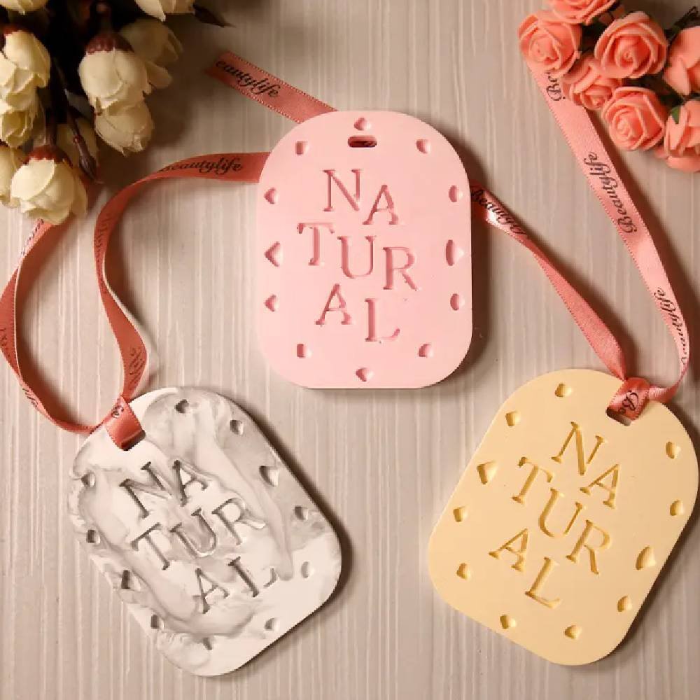 Moule en silicone pour céramique parfumée “Natural”, idéal pour créer des parfums solides, décorations aromatiques et créations DIY avec un design épuré et moderne. Il intègre le mot “Natural” en relief et un trou supérieur pour suspendre, parfait pour parfumer armoires, tiroirs ou voiture. Grâce à sa flexibilité, il permet un démoulage facile et un rendu précis.