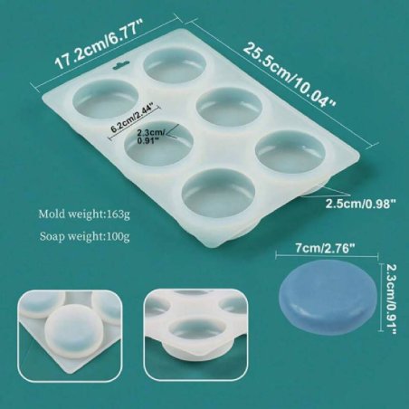 Ce moule en silicone avec 6 cavités circulaires est idéal pour fabriquer des pastilles de savon et des formulations de cosmétique solide (shampoing solide, après-shampoing, beurres et baumes en stick). Grâce à sa forme arrondie et sa finition lisse, les pièces obtenues ont un aspect moderne et soigné, parfaites pour un usage personnel ou comme cadeau artisanal. Fabriqué en silicone flexible de haute qualité, ce moule est réutilisable, résistant et très facile à démouler. Chaque cavité mesure environ 7 cm de diamètre, 2,3 cm de hauteur et a une capacité de 100 cc. Il est idéal pour les préparations cosmétiques solides et la savonnerie. Avec lui, vous pourrez créer des pastilles uniformes et régulières rapidement et facilement.