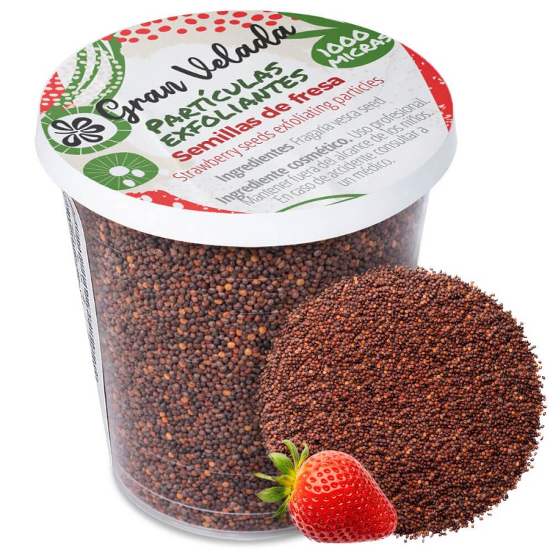 Graines de fraise de 1000 microns pour faire des exfoliants et des pelures maison. Faites vos propres gommages avec des graines de fraise et profitez de leurs propriétés! Ces graines de fraise sont totalement naturelles et sont utilisées dans les cosmétiques naturels comme ingrédient pour faire des gommages corporels. C’est une excellente particule exfoliante qui, en plus de remplir cette fonction, servira de décoration dans les savons. Parmi les propriétés des graines de fraise met en évidence son puissant effet antioxydant. N’hésitez pas à acheter des graines de fraises et à préparer vos propres pelures et gommages à la maison. Ce sera le complément idéal à vos exfoliants et wraps maison !