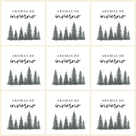 Autocollants « Arômes d’hiver » pour bougies en verre, au design hivernal avec sapins, parfaits pour décorer des bougies en verre et leur apporter une touche de Noël. Ce sont des adhésifs faciles à appliquer sur des surfaces propres et lisses ; idéals pour personnaliser cadeaux de Noël, coffrets ou collections parfumées de saison. Avec ces autocollants « Arômes d’hiver », tu pourras transformer tes bougies en verre en un détail festif en quelques secondes. Le motif de sapins et la typographie manuscrite s’adaptent à tous les styles : minimaliste, rustique ou nordique. Utilise-les pour créer des collections de bougies de Noël, kits à offrir ou pour décorer ta maison durant toute la saison hivernale.