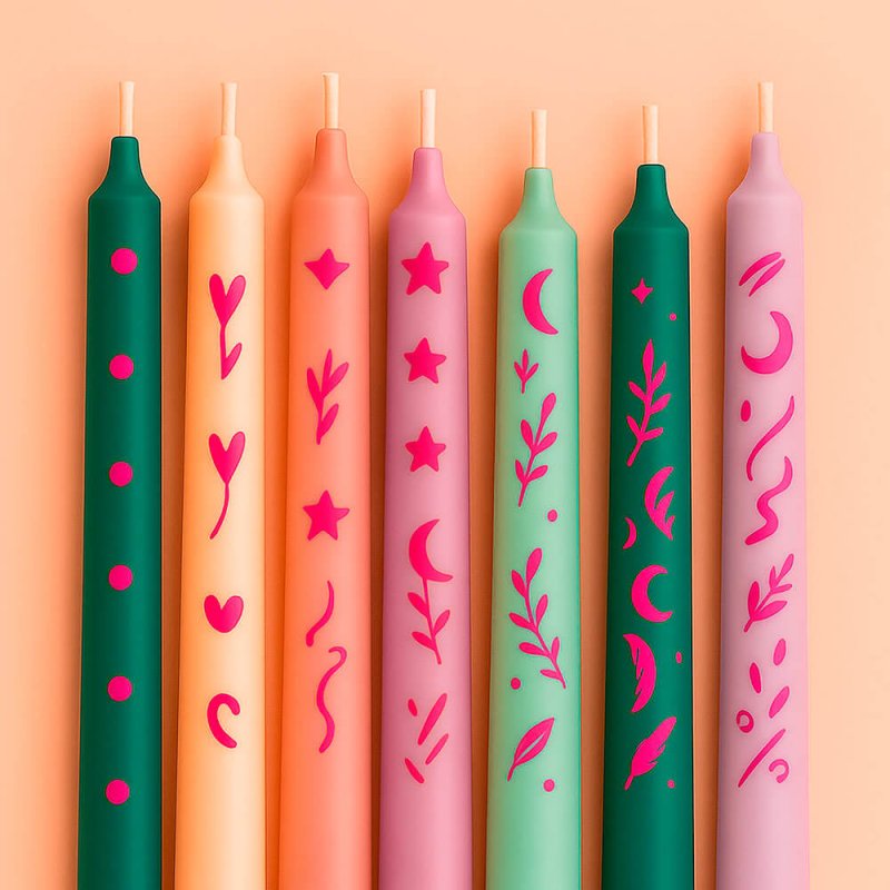 Voici étape par étape comment utiliser la peinture pour bougies. Elle est très simple à appliquer ! Elle sèche rapidement et adhère facilement à toute surface de cire. Vous pouvez l’appliquer directement avec un pinceau pour les petits détails ou utiliser la technique d’immersion pour recouvrir toute la bougie. Vous pouvez également utiliser un pochoir pour faciliter le dessin ou appliquer la couleur avec une éponge, technique appelée stencil.