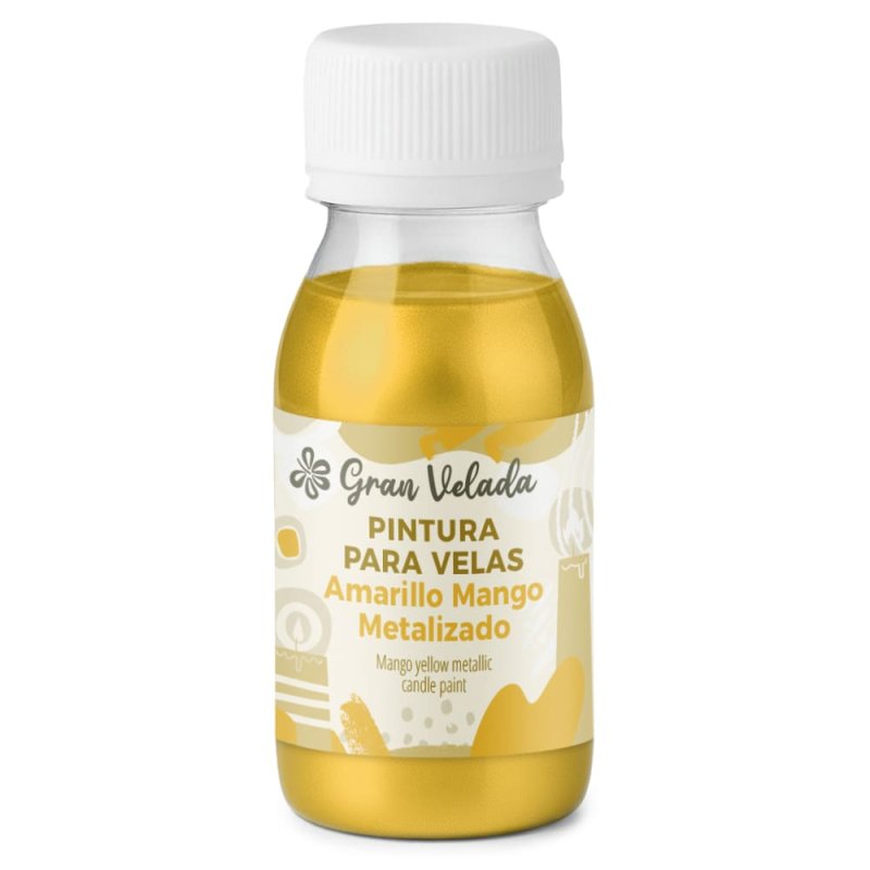 Peinture pour bougies jaune mangue métallisé, idéale pour peindre sur des surfaces en cire. Elle permet de décorer les bougies et photophores que vous réalisez à la maison. La peinture pour bougies que vous pouvez acheter chez Gran Velada se présente sous forme liquide et est très facile à utiliser. Il suffit de l’agiter puis de l’appliquer avec un pinceau ou une éponge sur la surface à décorer. Elle sèche rapidement. Vous pouvez aussi utiliser un pochoir pour obtenir des créations entièrement personnalisées. Son fini métallisé apporte une touche élégante et lumineuse à vos bougies. Commandez-la facilement via notre boutique en ligne !