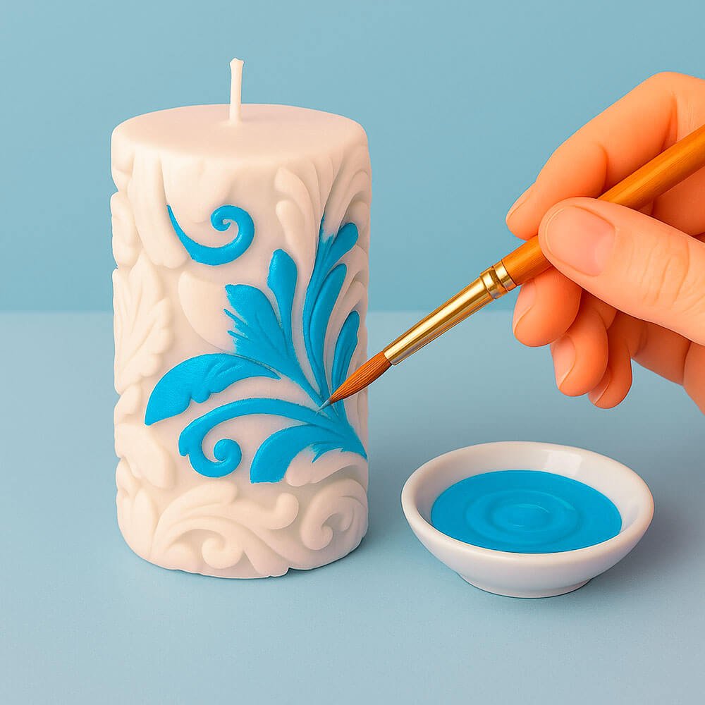 Voici étape par étape comment utiliser la peinture pour bougies. Elle sèche rapidement et adhère facilement à toute surface en cire. Vous pouvez l’appliquer au pinceau pour un travail de précision, avec une éponge type pochoir pour des effets créatifs, ou par trempage pour recouvrir entièrement la bougie.