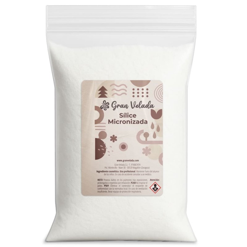 La silice micronisée est un minéral composé de silicium et d’oxygène. On le trouve dans la nature normalement sous forme de sable ou de quartz. Il est traité sous différentes formes et dans différentes tailles: sable, farine et micronisé, c’est ainsi que vous le trouverez ici. Les utilisations de la silice micronisée : céramiques, ciments, peintures, revêtements, mortiers... À Gran Velada, vous pouvez acheter de la silice micronisée dans des récipients de différentes tailles: de 100 gr à 5 kilos. C’est une poudre blanche que vous pouvez utiliser pour la fabrication de peintures, de plastiques et de caoutchoucs.