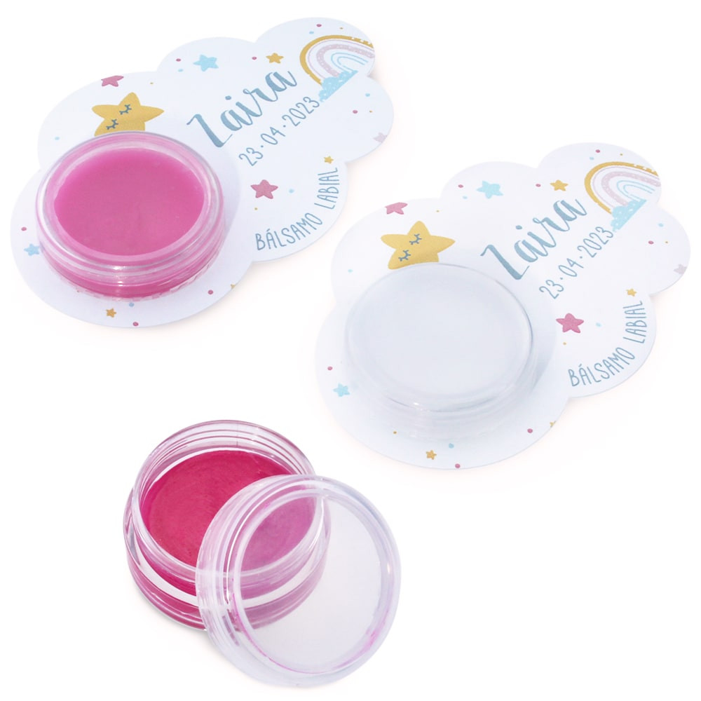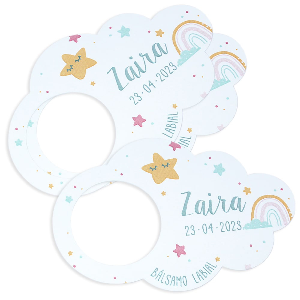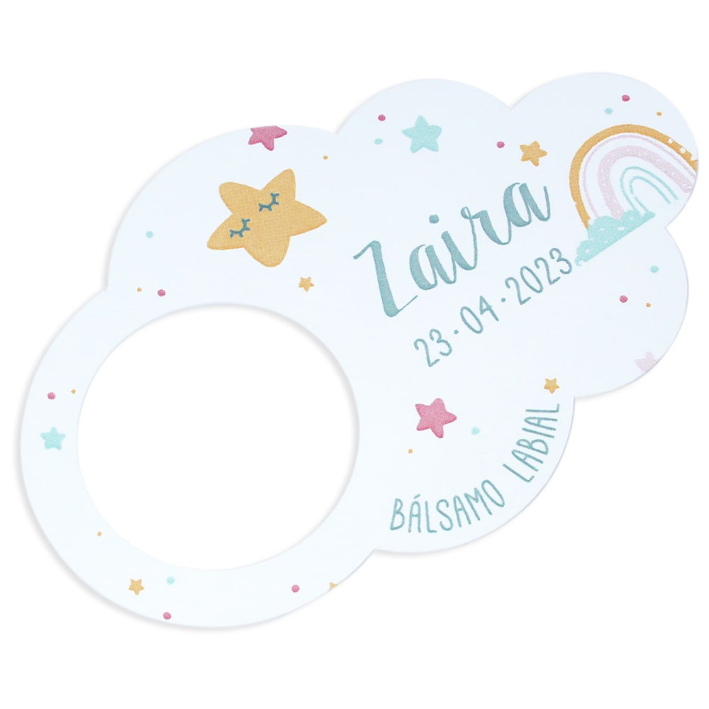 Pack de 12 cartons personnalisés pour l'emballage, idéal pour offrir des baumes à lèvres, des parfums solides, des échantillons de crème, des ombres à paupières, des paillettes et des paillettes... Ils sont une excellente option d'emballage pour les détails de baptême et de communion! Original et très percutant. Il s'agit d'un carton en forme de nuage avec un trou découpé à l'emporte-pièce de 3,7 cm à une extrémité. Il vous suffit de retirer ce morceau de carton et d'y placer un récipient rond. Dans ce cas, le carton a la forme d'un nuage et est décoré d'étoiles et d'arcs-en-ciel. Il peut être personnalisé avec le nom, la date, l'événement et le type de produit (baume à lèvres, parfum solide...) Gardez à l'esprit que s'il s'agit d'un nom composé ou avec de nombreux caractères, le design peut varier légèrement pour s'adapter à l'espace disponible. Vous obtiendrez un packaging très original pour vos créations DIY! Seul le carton est vendu. Récipient non inclus. Les produits personnalisés ne peuvent pas être payés à la livraison. Il faut au moins acheter deux packs de 12 cartons, soit 24 cartons.