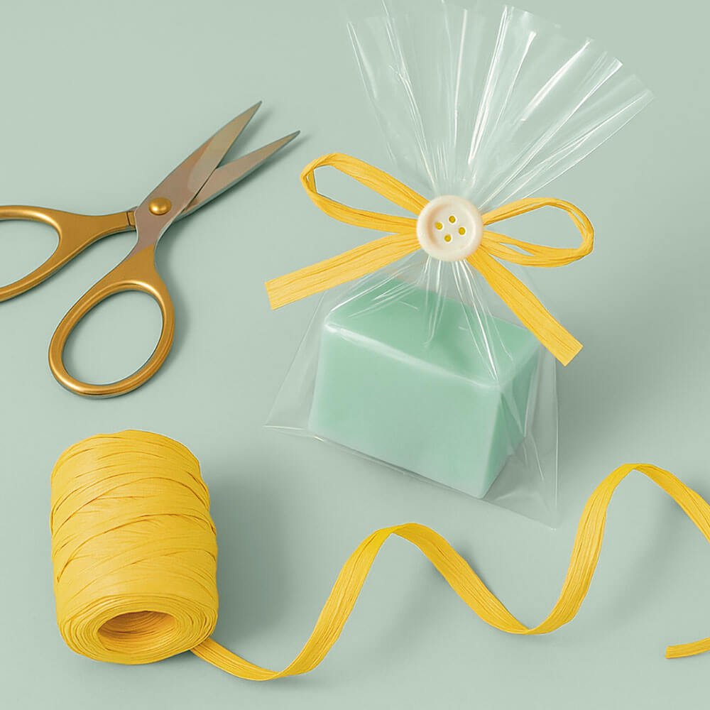 - - Décorez les savons faits à la main: enroulez simplement vos coupes de savon en barre dans de la cellophane et nouez autour d’un ruban de raphia. Un emballage de base qui fera ressortir vos savons. Et c’est que souvent le plus simple est le meilleur. Bien que vous puissiez toujours compléter l’emballage avec un papier décoratif, une bande de blonda... Il suffit de mettre un peu d’imagination.